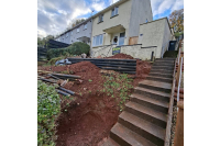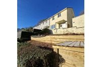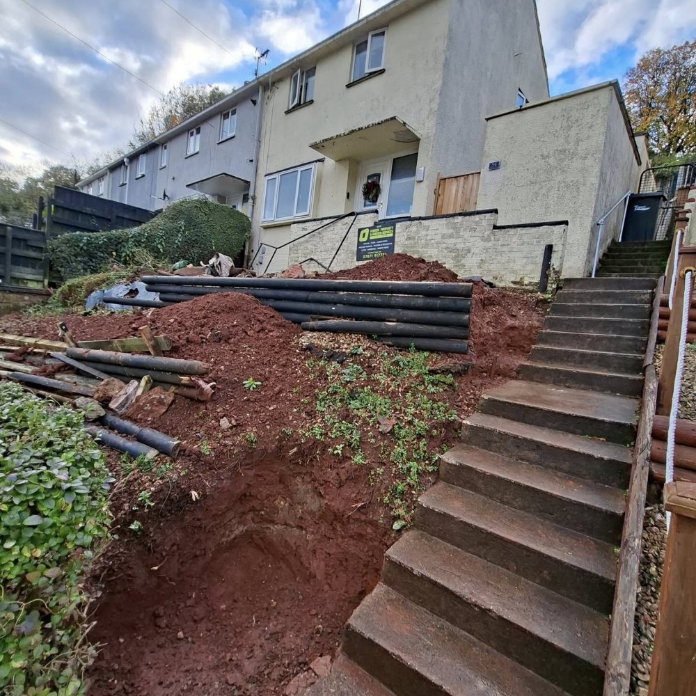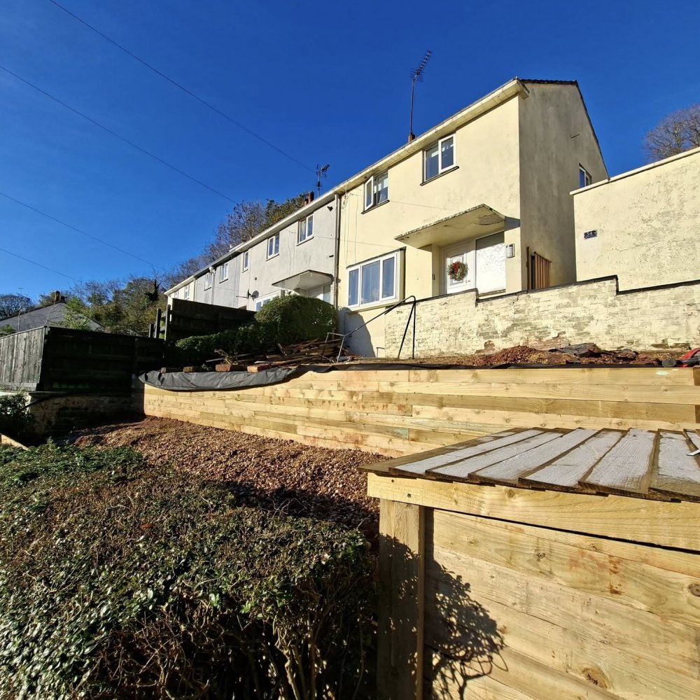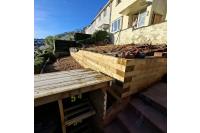 Down in the lower garden, they added a second retaining wall using our half-round timbers, perfectly prepped and ready for the customer to backfill and level off